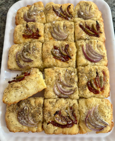 Remove dough from refrigerator; place in pan and press evenly until 1” from sides. The oil will make crispy edges when baked. With a bench scraper, precut (but do not remove) the dough into 15 rectangles, three down by five across.