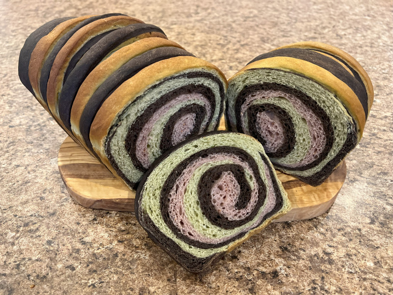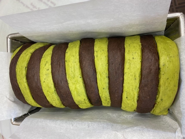Let doughs rise until doubled, about 1 ½ hours. Roll green dough into a 10” x 12”
