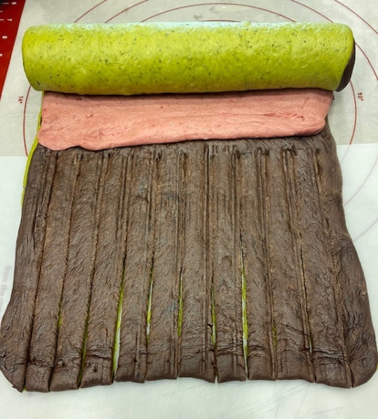 Starting with the 10” side of 3-layered dough, roll dough into a log until dough is only