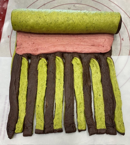 Skipping first strip, carefully flip second cut strip to expose green dough on opposite